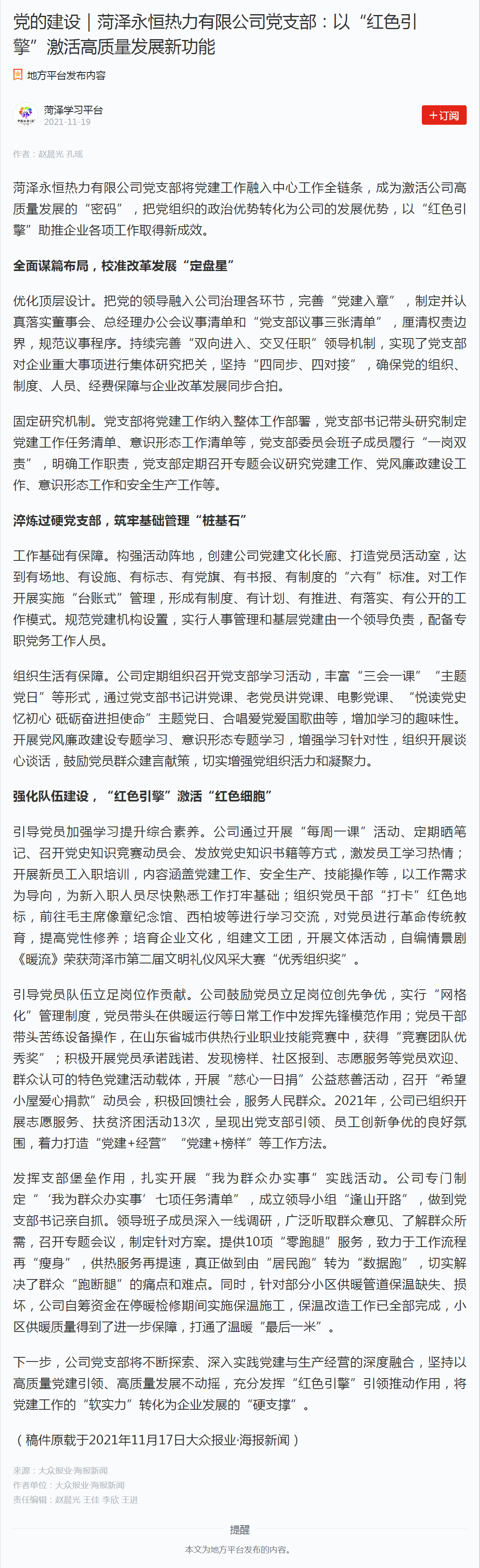 黨的建設|菏澤永恒熱力有限公司黨支部:以“紅色引擎”激活高質量發展新功能