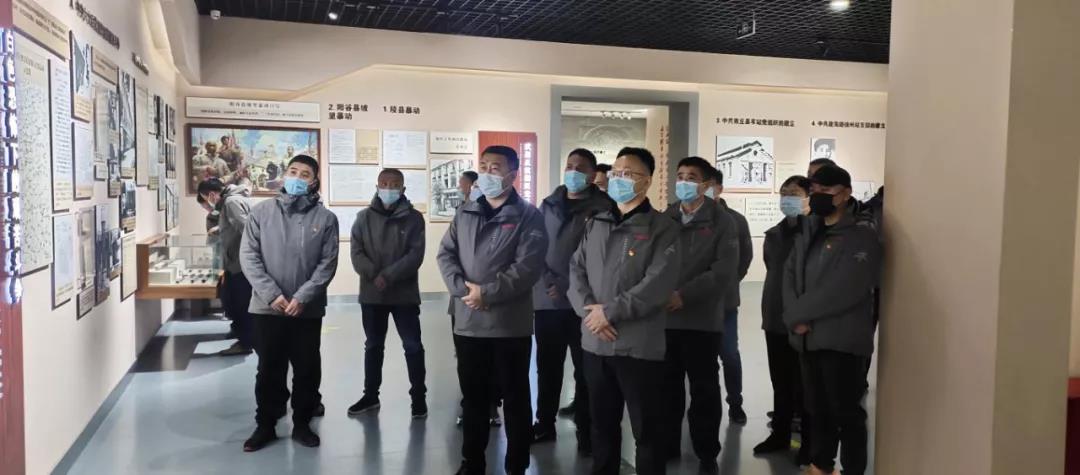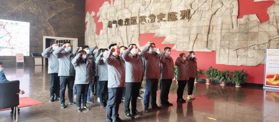在菏澤冀魯豫邊區革命紀念館序廳內,由支部書記肖培飛同志領誓,全體黨員整齊列隊,鄭重舉起右手,集體重溫入黨誓詞。