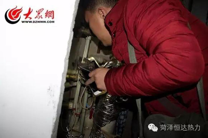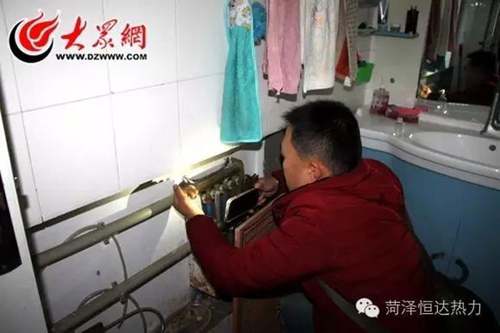 劉明賢在D棟12樓居民張大爺家中測(cè)試溫度,室溫剛剛達(dá)標(biāo),劉明賢和任永輝開(kāi)始查找原因