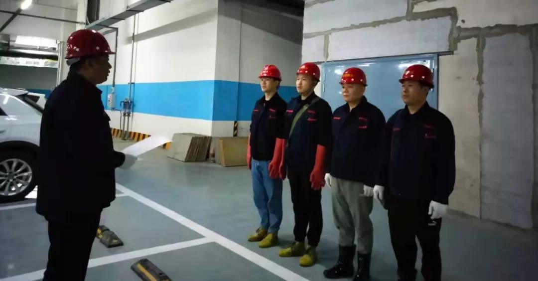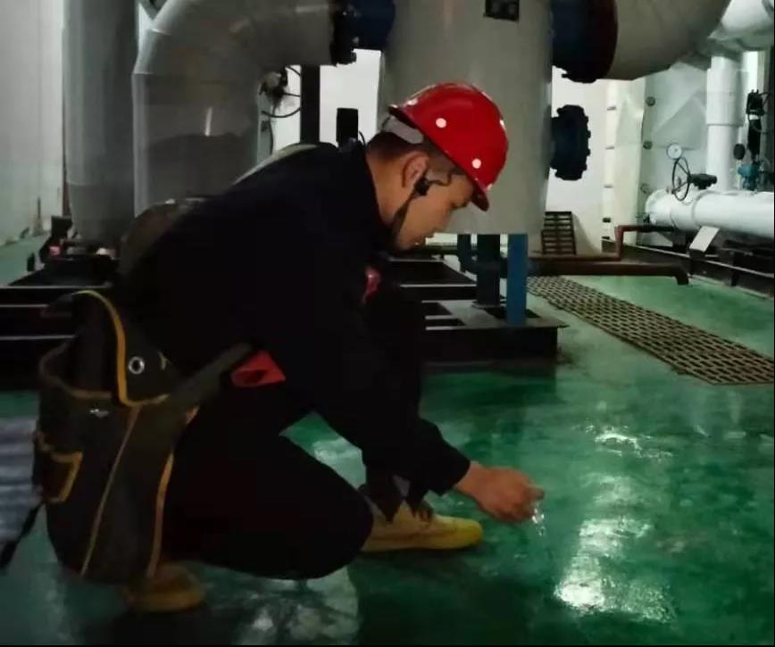演練正式開始。按照事前部署,管理員趙飛在巡查換熱站時,打開換熱站門,發現地面有積水,排除自來水泄露原因,趙飛立刻判定是設備某處漏水。他快速穿戴好絕緣裝備,掏出工具包中的電筆,檢測地面和配電柜是否存在漏電隱患。隱患排除后,趙飛打開站內照明設備,機動組人員進入站內排查漏水原因。